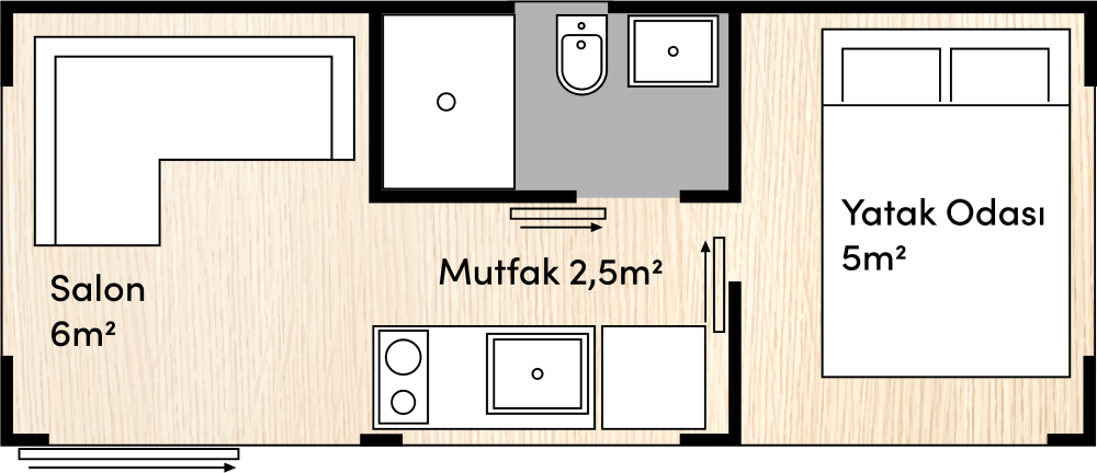 - 7 Meter lang, 2,55 Meter breit, 1+1-Grundriss